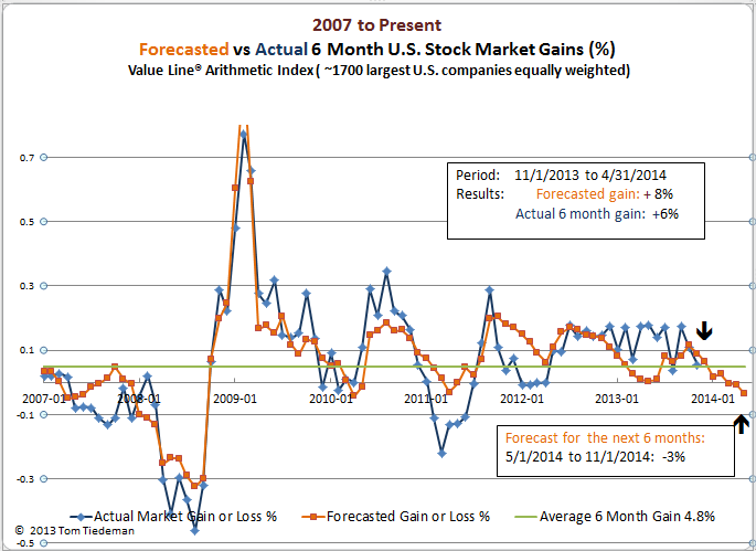 For the most recent completed forecasting period, September through April, the model did well. It had forecasted an 8% gain in the market (measured via the Value Line Arithmetic Index) while the actual gain was 6%. For the past year the market has generally turned in better than forecasted gains.