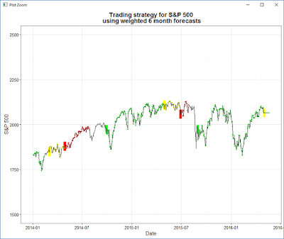 The immediate prospects for the stock market, however, are much less clear and are not as bad as the longer term forecast. As shown below the short term forecasting model is now flashing a warning. Based on the current negative 6 month forecast next month the short term forecasting model will probably be flashing a sell signal.