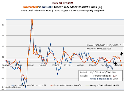 May 2016 through October 2016: Watch out. The six month stock market forecast is bad and the near term forecast is flashing yellow. Next month the short term forecast will almost certainly turn red. My forecasting models expect the U.S. stock market to fall significantly over the coming half year; and that doesn’t factor in the presidential election which is likely to create additional volatility.