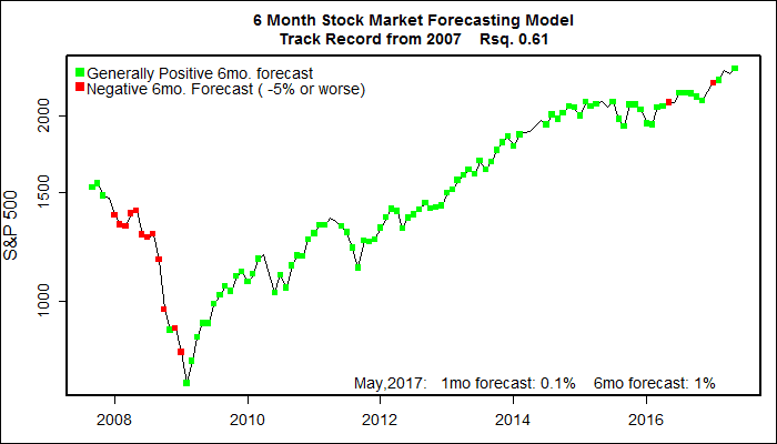 The current six month stock market forecast for May through October, 2017 is nearly flat — a sub-normal 1% gain over the coming half-year, and no gains during May. The likelihood of the market at least breaking even over the next half year is 0.71, slightly less than average. Meh.