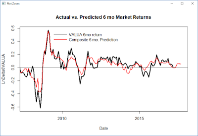 The forecasting models have been very accurate so far this year. (Better than my long term testing would have expected.) The graph below shows, month-by-month the actual gains of the Value Line Arithmetic Average (black) and the results for the same period that my models had predicted 6 months earlier (red).