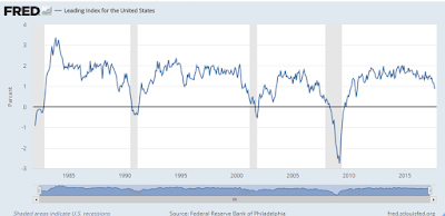 Finally, the Leading Index for the U.S. economy as posted on the Federal Reserve data website has decidedly turned down. Every time the fall has reached today’s level, the U.S. has gone into recession within a couple of years.