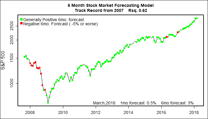 One Month Stock Market Forecast March, 2018: 0.5% gain ( near average)