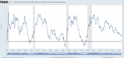 The chart below shows the spread (the difference) between 10 year interest rates and 3 month interest rates in the U.S. When the spread goes to zero or even turns negative, a recession surely follows with a time lag of 6 months to a year. Same story for the stock market which reacts to bad news faster than the economy.