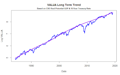 The advantage of using the Value Line Arithmetic Index (VALUA) for my trend line is simply that it is more predictable. Much less heavy-handed editing is necessary in order to escape from being distorted by market booms and busts. The final trend line for VALUA that I will concentrate on in my monthly forecasts is shown below. We will see how it performs over time.