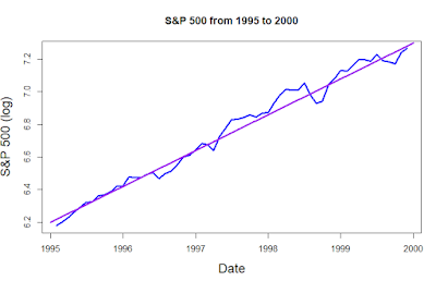 Most of the time, the stock market behaves fairly rationally, and then some times it does not. So, in the final definition of the trend line model I will take the crazy times out of the modeling process. The graph below shows the S&P 500 from 1984, but data for the dates during the major market crises have simply been removed.