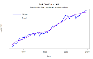 The next graph shows the final trend line for the S&P 500, based on long term GDP, smoothed interest rates, and ignoring proven market bubbles and crashes.