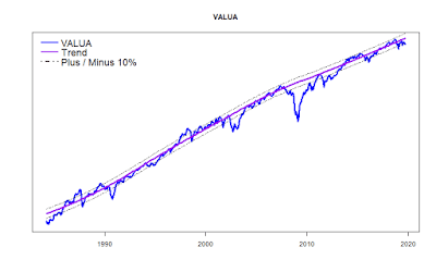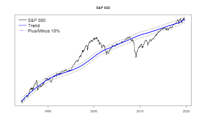 The S&P 500 trend is well within its normal trend zone. But, the much more predictable Value Line Arithmetic Average is right at the lower boundary — 10% below its many decade trend. Good reason to be concerned.