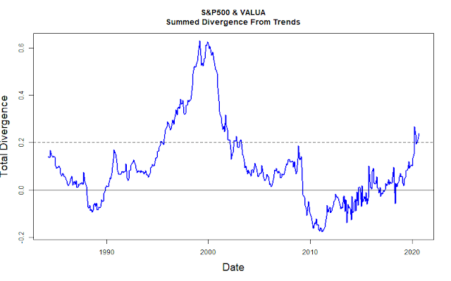 For years I have followed historical trend lines for of the Value Line Arithmetic Average and the S&P 500. Currently, VALUA is about 10% below its long term trend which makes sense given how rotten the economy is. Personally, I am surprised it is doing so well. The S&P 500, however, is about 10% above its historic trend line. When I graph the trend line divergence of these two indexes a scary picture emerges.