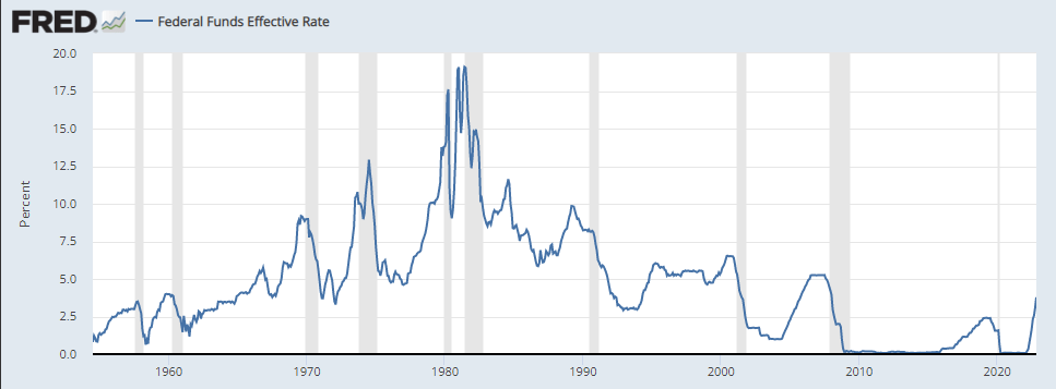 Short-term interest rates sharply up nearly 4%. This is already as much of an interest rate increase as the Fed typically has used in the past to damp down the economy, but it has never raised rates so fast. Another point up or so seems likely but in smaller increments.