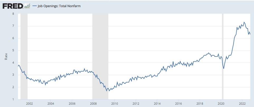 In its most positive view, the Federal Reserve expects Real GDP growth of just 0.5% in 2023 — very near a recession. My back-of-the-envelope calculation is that, though the Case-Shiller U.S. National House Price Index has fallen a few percent, house prices still needs to drop 10% to 15% more. Job Openings have fallen a bit, but remain incredibly strong — for now. Unemployment, still rock bottom at 3.7%, will probably double.
