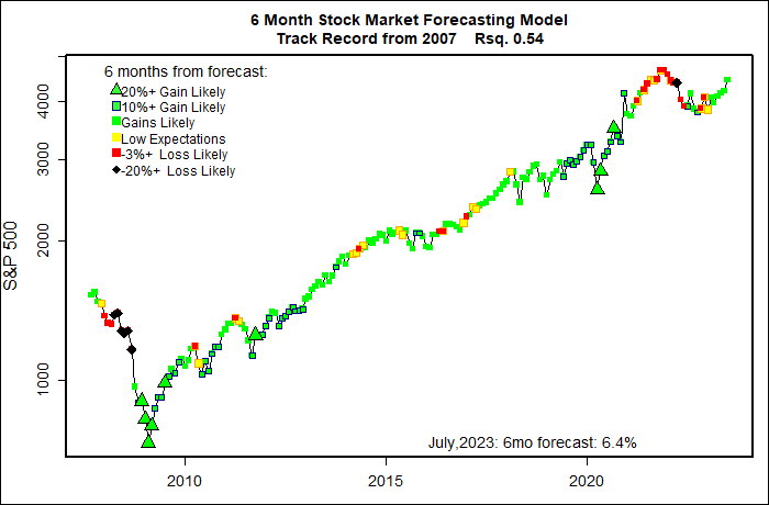 June market performance was excellent, but that causes my one-month market forecast to expect a balancing drop of a percent or two — not a big deal. If the market decides to turn negative, the worst 3-month loss my forecasts expect would be just about 6%.