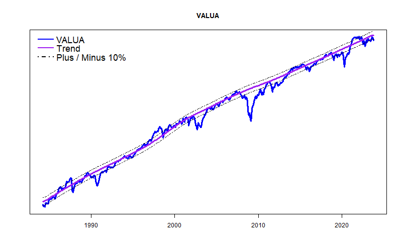 The stock market usually stages its big moves when it has strayed far from its long-term trend. Frothy prices bring a downdraft and a panic crash quickly turns into a recovery. As shown in the graph below, both the ValueLine Arithmetic Average and the S&P 500 are very near their long-term trend lines. Unless something drastic happens in the world, a major stock market move is unlikely. Looks to me like the Federal Reserve has indeed achieved a soft landing.