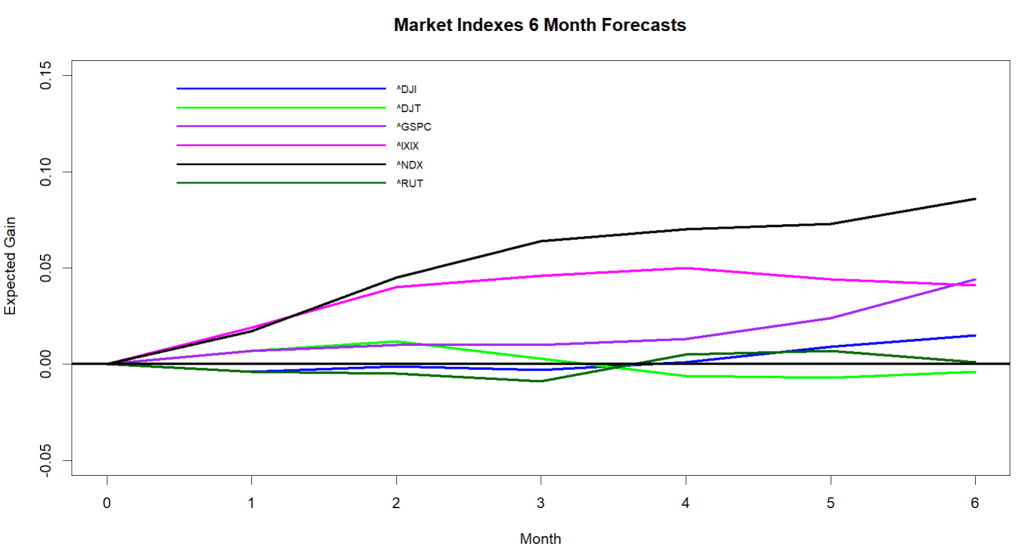 January, however, will probably lead to temporary setbacks for tech stocks. Even though the 1-month forecasts for the NASDAQ and the NASDAQ 100 are both positive, the 1-month forecasts for leveraged inverse ETFs for these indexes are very strong. The models for these inverse ETFs indicate that the runups over November and December were just too strong, and a short-term pull-back is likely.