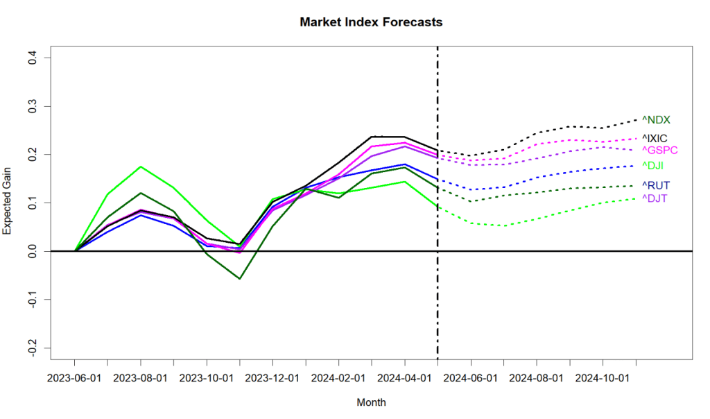 Last month the forecast for the S&P 500 was less than 1/2 of one percent positive. (Sub-Meh) But, it was POSITIVE, and for the last several months the market has been behaving above expectations. Now the tide has shifted and all the major indexes have projected 1-month losses of -1% to -3%. Does not look horribly bad, but the immediate expectation is now negative, and for the broader market the 6 month forecast is negative. The old adage “Sell in May…” looks like a winner this year.