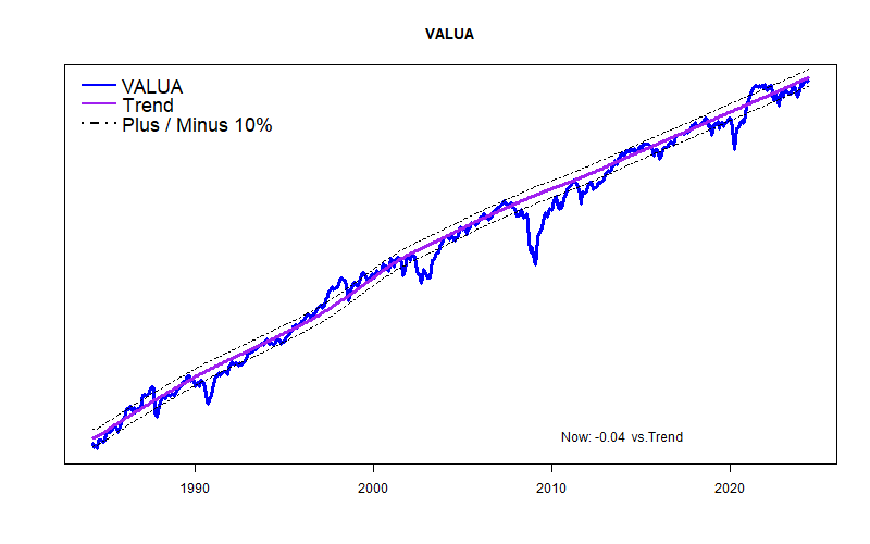 Looking at the long-term trend lines, the S&P 500 is about 8% above the long term trend and the Value Line Arithmetic Average is 4% below trend.