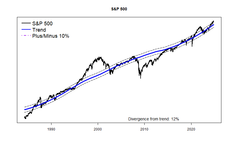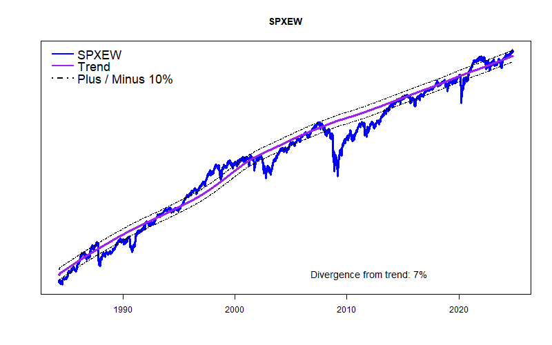 Last month’s sharp stock market decline puts the S&P 500 price almost exactly at my long-term price trend line, and the equal-weight Value Line Arithmetic Average is about 8% BELOW trend. So, unlike a few months ago, stocks now “have room” to move either up or down. That’s a good thing, but does nothing to suggest what happens next.