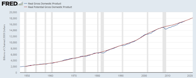 The match between actual GDP and the CBO model are amazingly close nearly all of the time. The big exception of course is when actual GDP plummets several percent causing the country to suffer a recession. (The gap caused by the Great Recession was unusually large — that’s why it was the ‘Great’ recession.) As a general rule, the stock market suffers a collapse as investors realize a recession is nigh, and the market rebounds sharply when it appears that the economy is likely to recover.