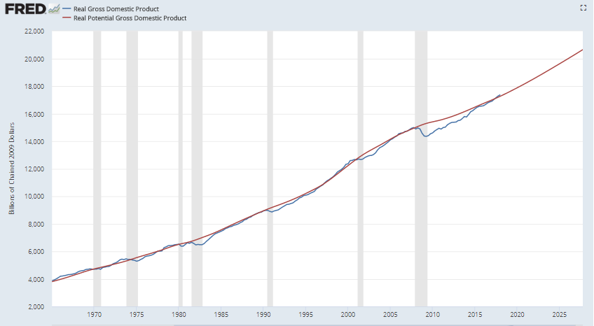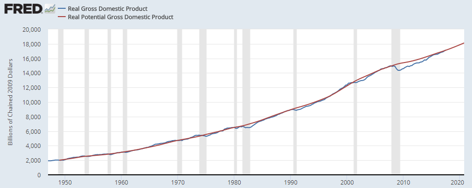 The graph below was downloaded from the Federal Reserve public data site ‘FRED’. It shows CBO’s Real Potential GDP model and actual values for U.S. Real GDP. (‘Real’ meaning that inflation has removed from the data so that everything is shown in constant 2009 dollars.)
