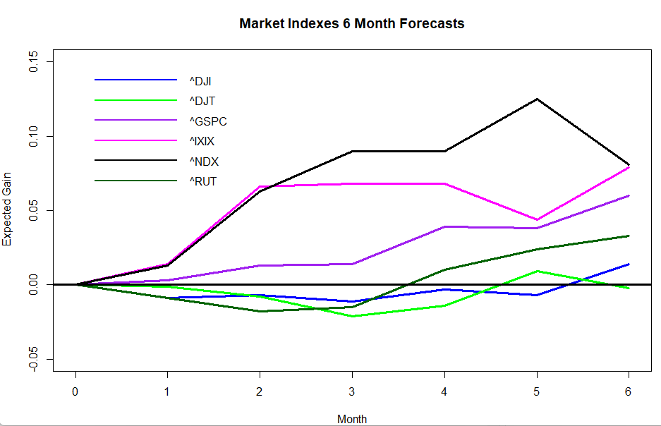 My older econometric forecast formulas (followed since 2007, R.sq ~ 0.5) are turning somewhat pessimistic for the coming half year with an expected SP500 loss of roughly 4%. The 6-month probability of loss is slightly higher than the probability of gain. The newer forecasts (graph above) are based on much more data and “should” be more accurate. Just like last month, the newer forecasting models are a bit more positive than my older models with the SP500 gaining a bit for the next two months, but then falling so that the index is essentially flat by the end of July. Both sets of models are starting to fret a bit about late spring.